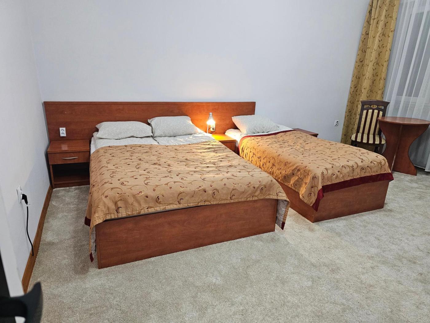 Pokój Dwuosobowy typu Standard ze wspólną łazienką. The double room includes a shared bathroom fitted with a shower, a hairdryer and slippers. The double room offers a carpeted floor, heating and a quiet street view. The unit has 2 beds. Pokój Dwuosobowy - 2 osobowy. Powierzchnia pokoju ok.: 10 mkw.