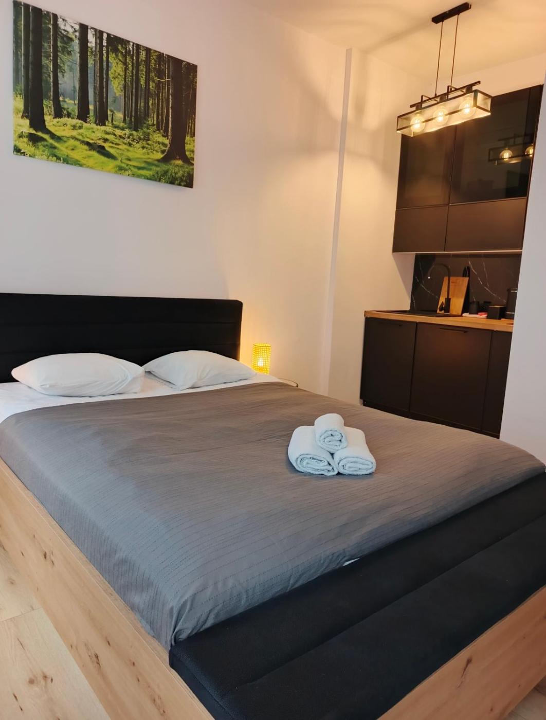 Apartament typu studio. This apartment comprises 1 bedroom, a kitchenette and 1 bathroom with a shower and a hairdryer. In the kitchenette, guests will find a stovetop, a refrigerator, kitchenware and an electric kettle. This apartment features a dining area, heating and a flat-screen TV. The unit offers 1 bed. Apartament - 2 osobowy. Powierzchnia pokoju ok.: 25 mkw.